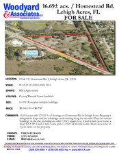 16.69± acres with 1,733± ft. of frontage on Homestead Rd. in Lehigh Acres. Property is triangular in shape and has a drainage canal running along the east side. There are several buildings on the site, including an older 1,592± square foot, 2 bed/2 bath pool home, a small 925± SF 2 bed/1 bath home and a 1,152± SF mobile home. There are a total of 4 pole barns on the property.